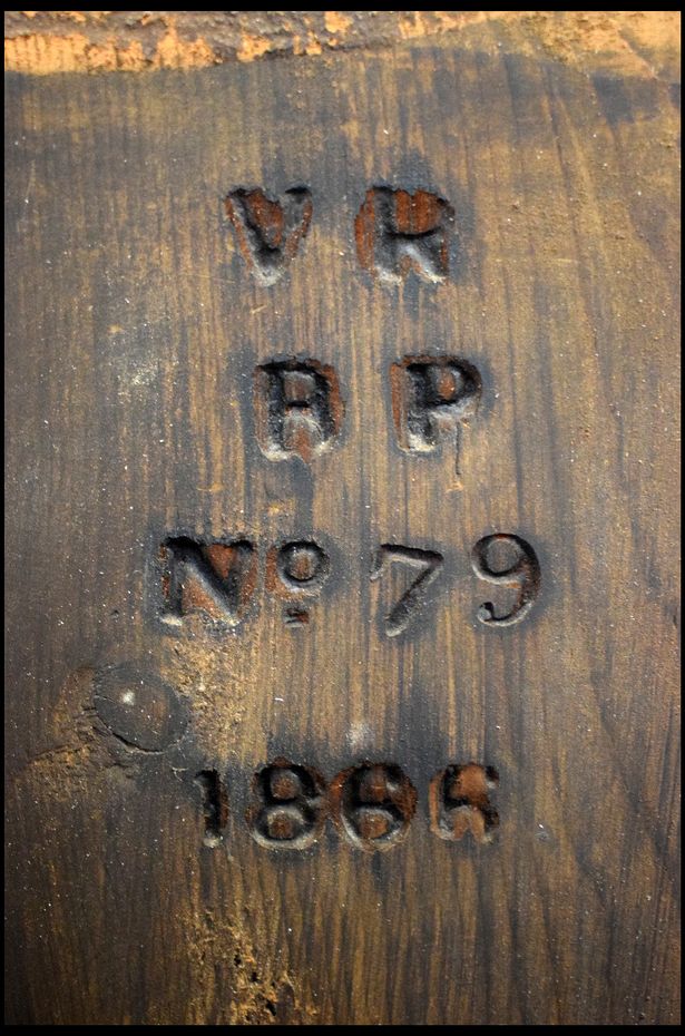 The marking, carved into the wood, states ‘VR BP No.79 1866’ – which stands for Victoria Regina, Buckingham Palace, used in Room 79 and dated to the year 1866.
