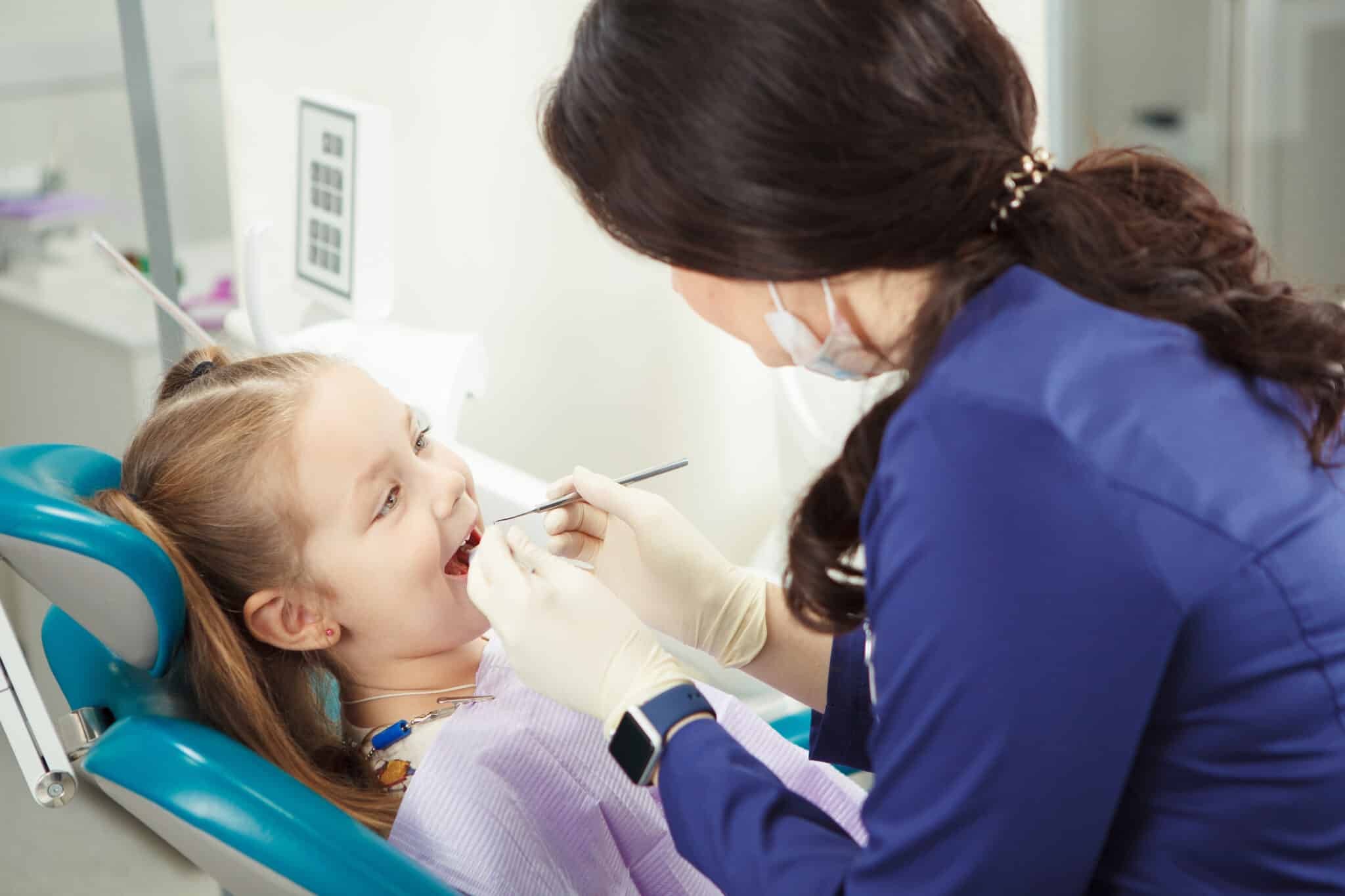 Before permanent teeth start to grow, children’s milk teeth usually fall out on their own without a dentist’s help. They can put them under their pillow for the tooth fairy who in exchange for the tooth will put there a small present. However, sometimes a milk tooth just gets stuck and comes out only when a dentist extracts it. This little girl in the picture is young so her milk teeth are still intact so certainly nothing painful will happen and she will leave the place with a smile on her face.