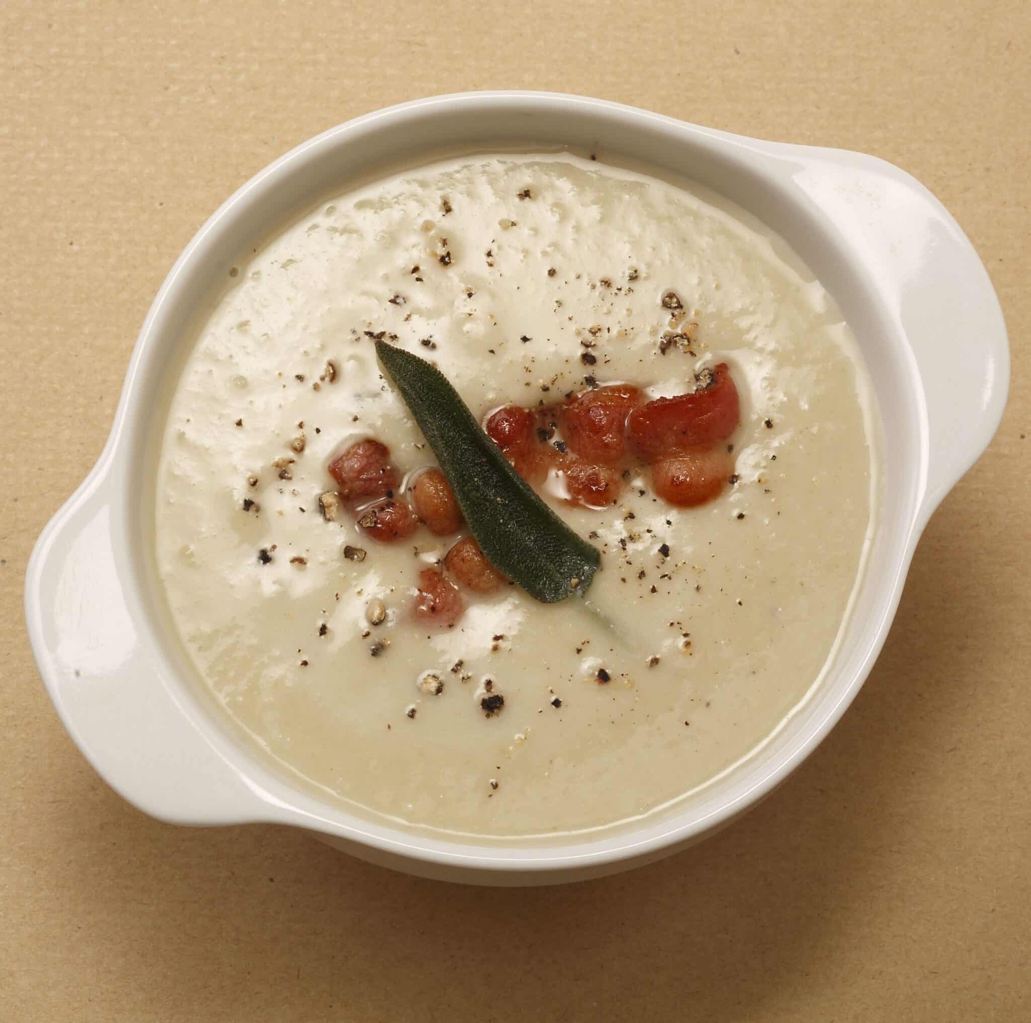 5. Re-warm the soup if necessary and pour it into serving bowls. Scatter bacon on top and sage leaves, if using.
