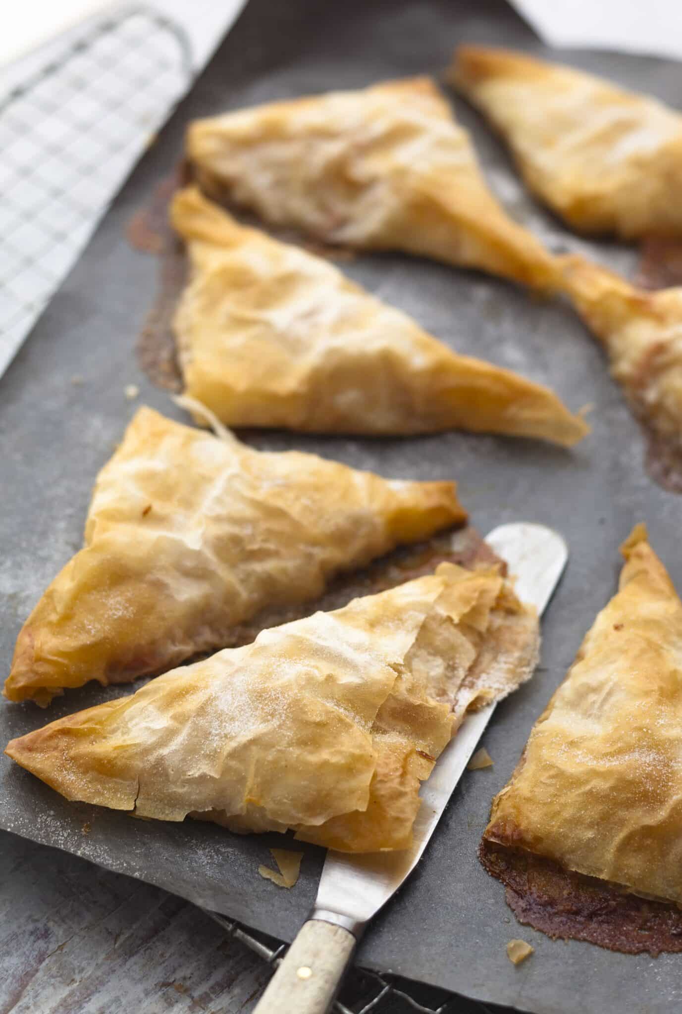 Finely chop 2 Jazz/Pink Lady apples. Mix with zest and juice of ½ a lemon, ½ tsp cinnamon and 2 tsp cornflour. Brush 6 sheets of filo pastry with 40g melted butter. Halve each sheet lengthways; sprinkle with 2 tsp caster sugar. Divide apple mix between them, at bottom edge. Fold pastry and filling over and over, making triangles. Put on a lined baking sheet. Brush with butter. Bake at 190°C or Gas Mark 5 for 25 mins until golden. Sprinkle with more sugar.