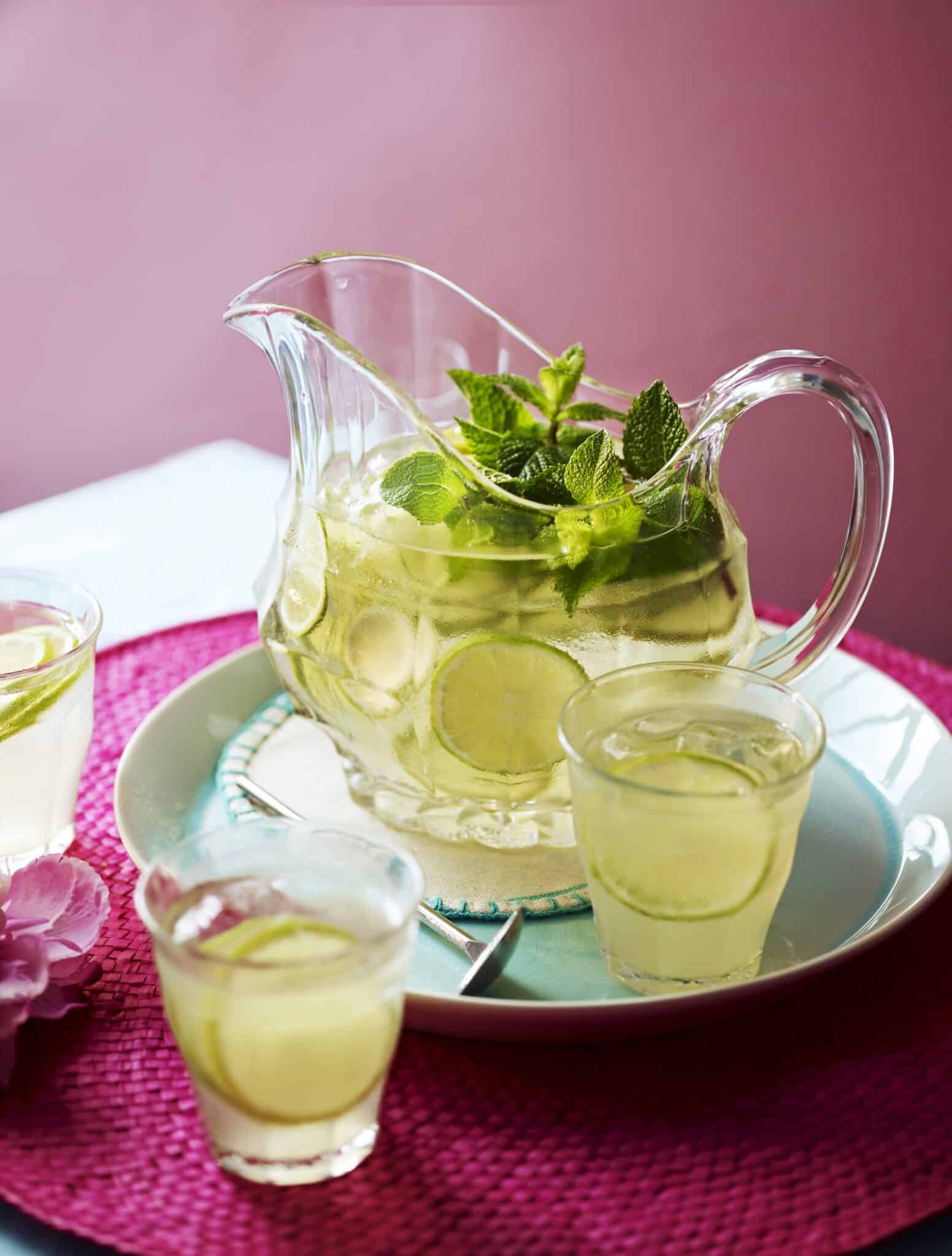Put the lime juice, slices of lime and sugar in a large jug and add the lemonade. Chill for an hour. Top up with soda or sparkling water. Serve over ice, with lots of mint sprigs.