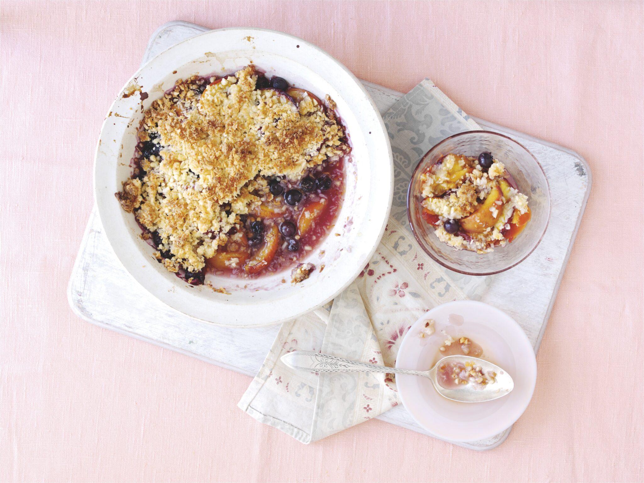 1.       Set the oven to 180°C or Gas Mark 4. Put the peaches and blueberries int he dish. Sprinkle with all but 2tbsp of the sugar, and the vanilla, if using, and mix in gently with your hand.