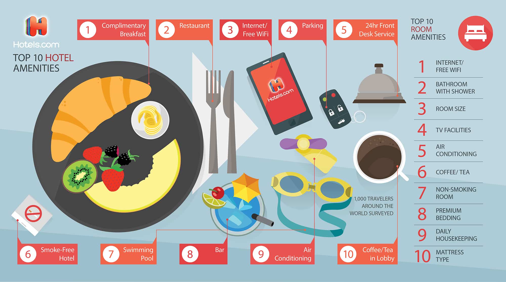 “Popular hotel amenities like parking, non-smoking rooms and pools have become more standardized, and we’re seeing that travellers are placing more value on quality food options than ever before which is good news for foodies!”said Taylor L. Cole, travel expert for Hotels.com.